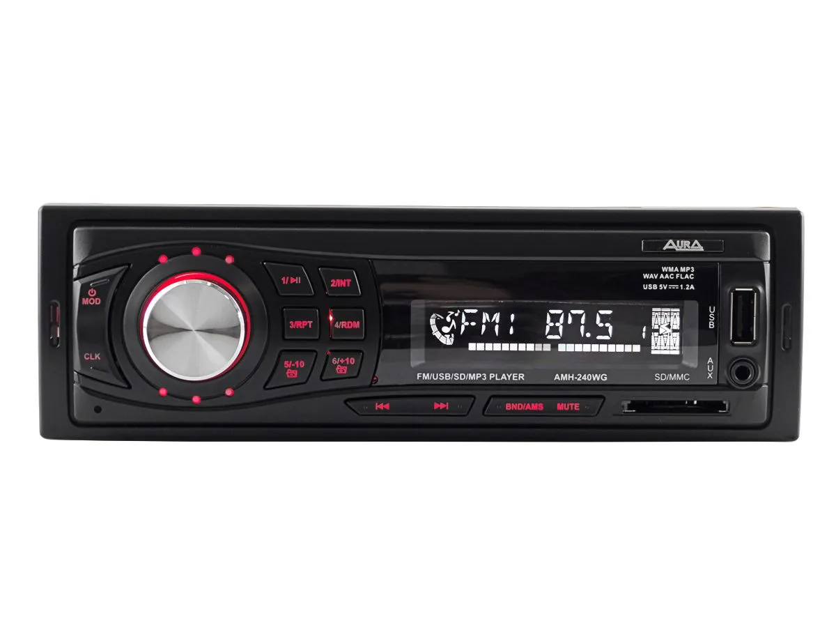 Магнитола AurA AMH-240WG отличается привлекательным дизайном и имеет расширенный набор звуковых настроек.