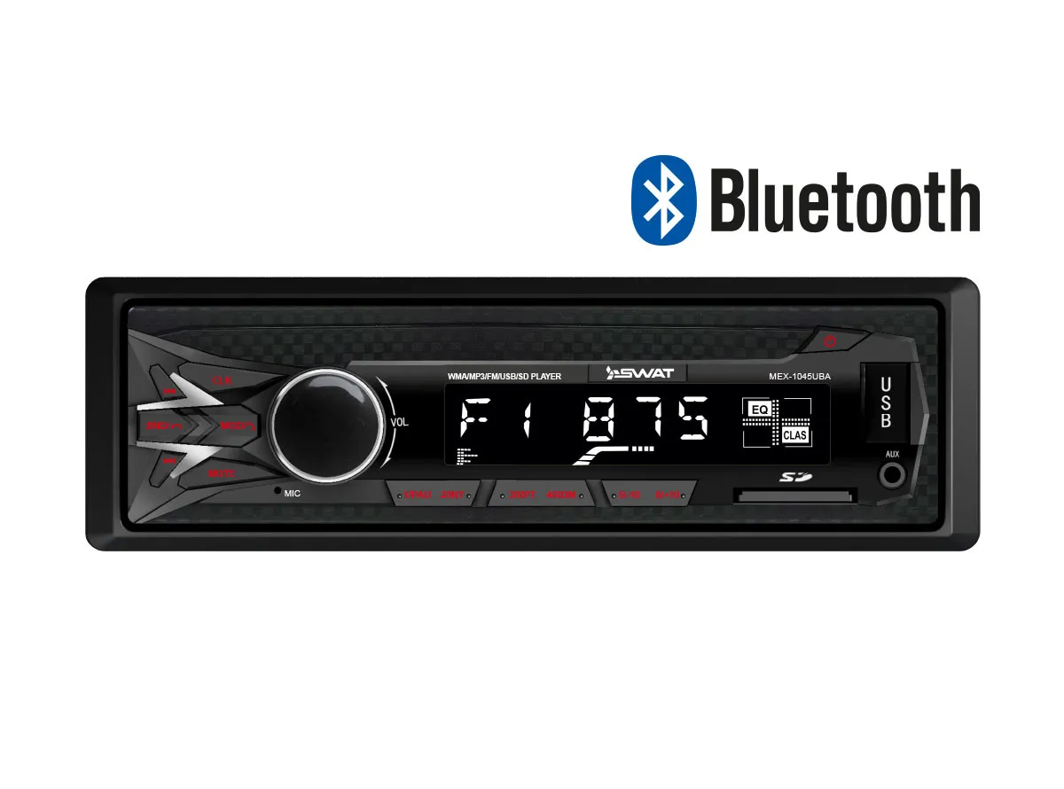 На передней панели автомагнитолы Swat MEX-1045UBA с эквалайзером есть USB-порт для подключения флеш-накопителя, смартфона или другого устройства, воспроизводящего музыку. Модель поддерживает беспроводное аудиовоспроизведение по Bluetooth, а в ее памяти можно сохранить 18 радиостанций, чтобы не тратить время на поиск любимой волны.